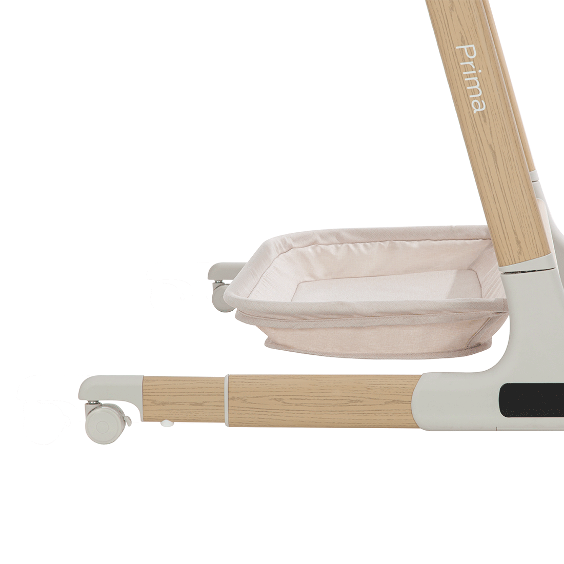 Prima ist in 6 Stufen höhenverstellbar. Die Positionen werden über seitliche Tasten verstellt. Die Wahl des Neigungswinkels der Liegefläche sorgt für freies Atmen des Babys bei Erkältungen oder bei Reflux.
