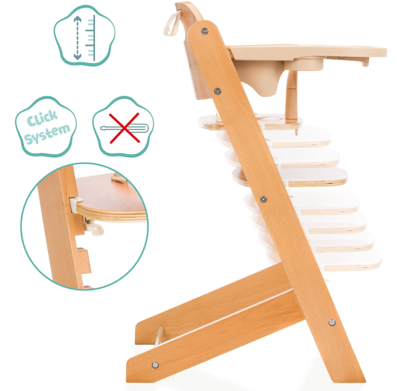 Der Hochstuhl Pia ist dank seiner cleveren Klickvorrichtung besonders benutzerfreundlich. Sitzfläche und Fussstütze lassen sich mühelos anpassen, sodass der Stuhl mit Ihrem Kind mitwächst, ohne dass lästiges Auseinanderschrauben erforderlich ist. Ein 5-Punkt-Gurt sorgt für zusätzliche Sicherheit und verhindert das Herausfallen Ihres Kindes. Das Set wird durch ein abnehmbares, abwaschbares Essbrett und einen praktischen Bügel mit integriertem Becherhalter ergänzt, die den Alltag erleichtern.