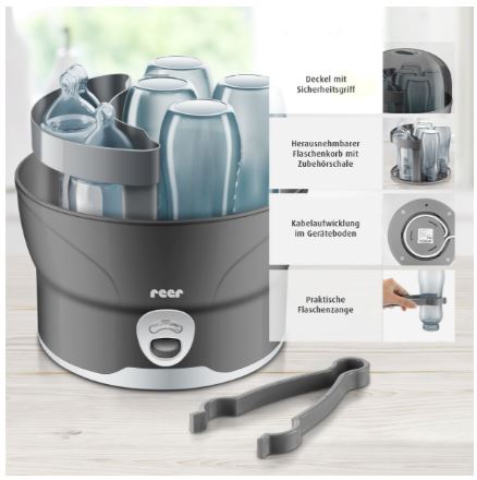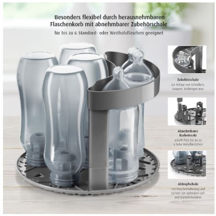 Der VapoMax S besitzt einen Flaschenkorb mit abnehmbarer Zubehörschale. So können alle benötigten Utensilien gleichzeitig desinfiziert werden. Die Zubehörschale hat ausreichend Platz für Schnuller, Sauger, Beißringe uvm. Wird die Zubehörschale gerade nicht benötigt, bietet der geräumige Flaschenkorb Platz für bis zu 6 großen Flaschen.